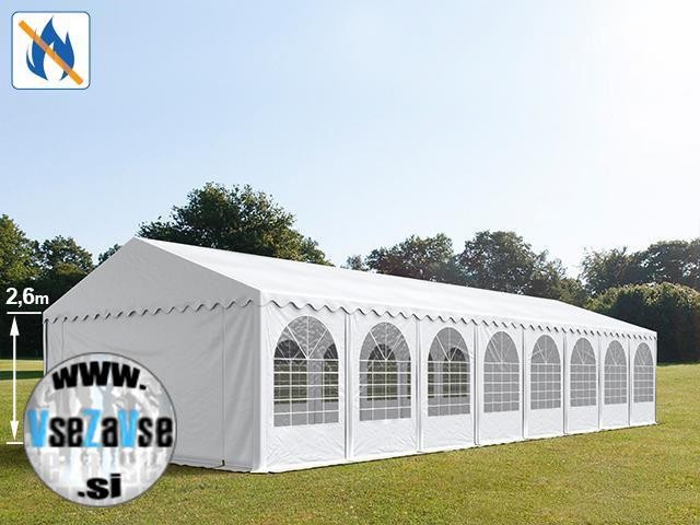 Prireditveni šotori 6mx(6,8,10,12,14,16,20,24)m, PVC ponjava 1400, stranska višina 2,6m; ognjevaren, s tlemi